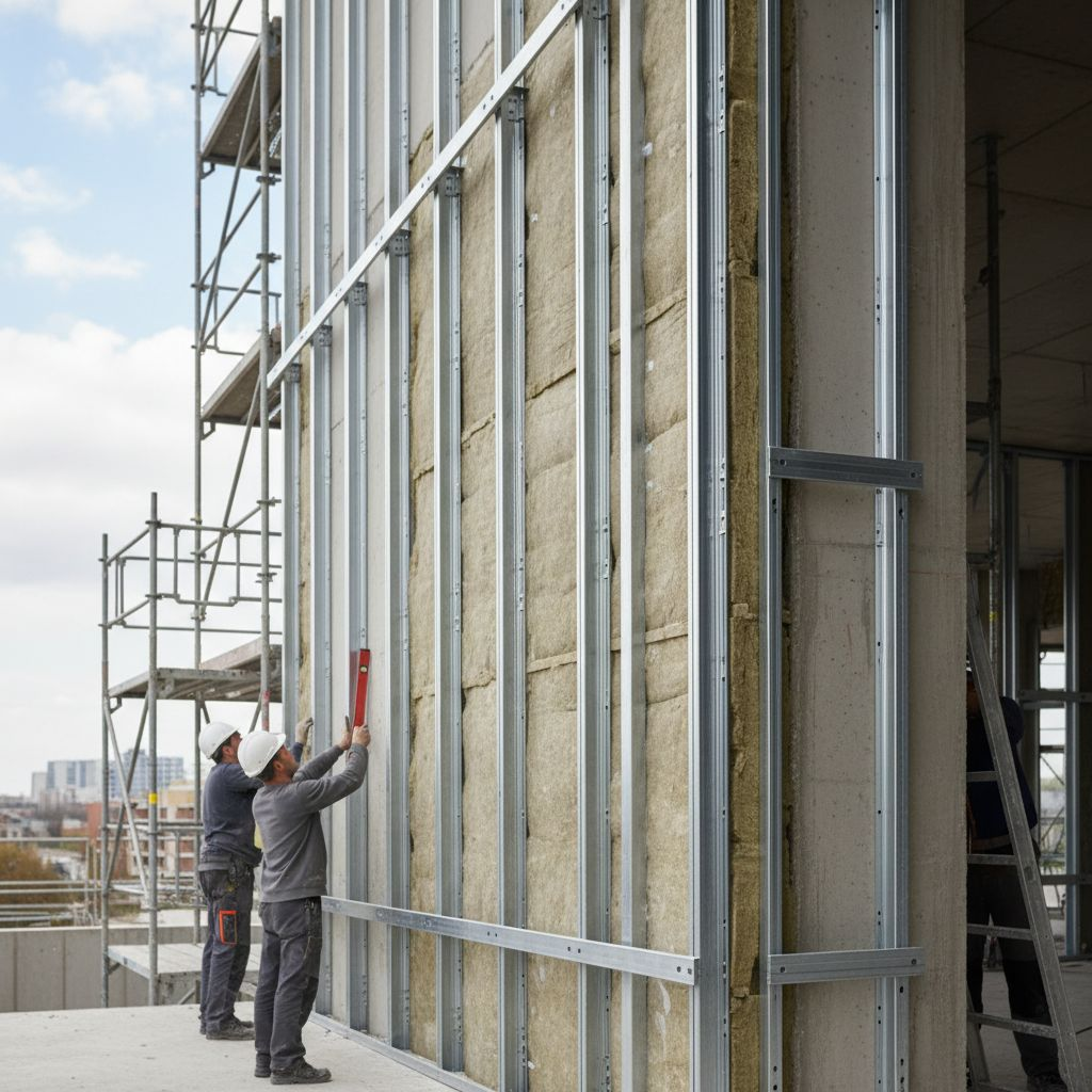 Скрипт генерации изображения 3: Реалистичная фотография монтажа алюминиевой подсистемы REVENTAL на строительной площадке, видны кронштейны, вертикальные направляющие и установленный утеплитель, нейтральный свет, динамичная сцена с рабочим моментом без лицевого распознавания, ракурс слегка снизу, акцент на ровности профилей и чистоте швов, детализация крепежа, без логотипов и текста.